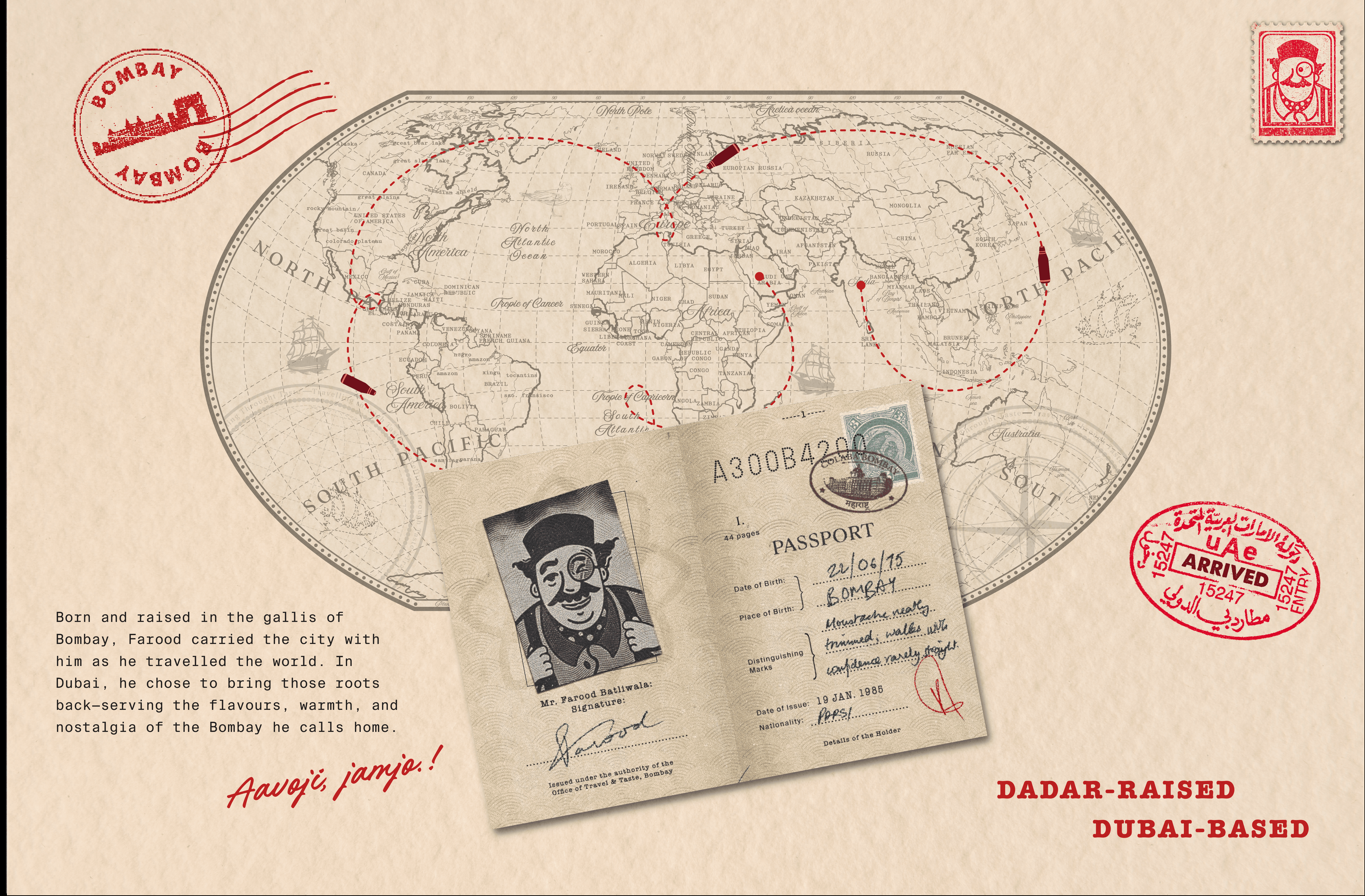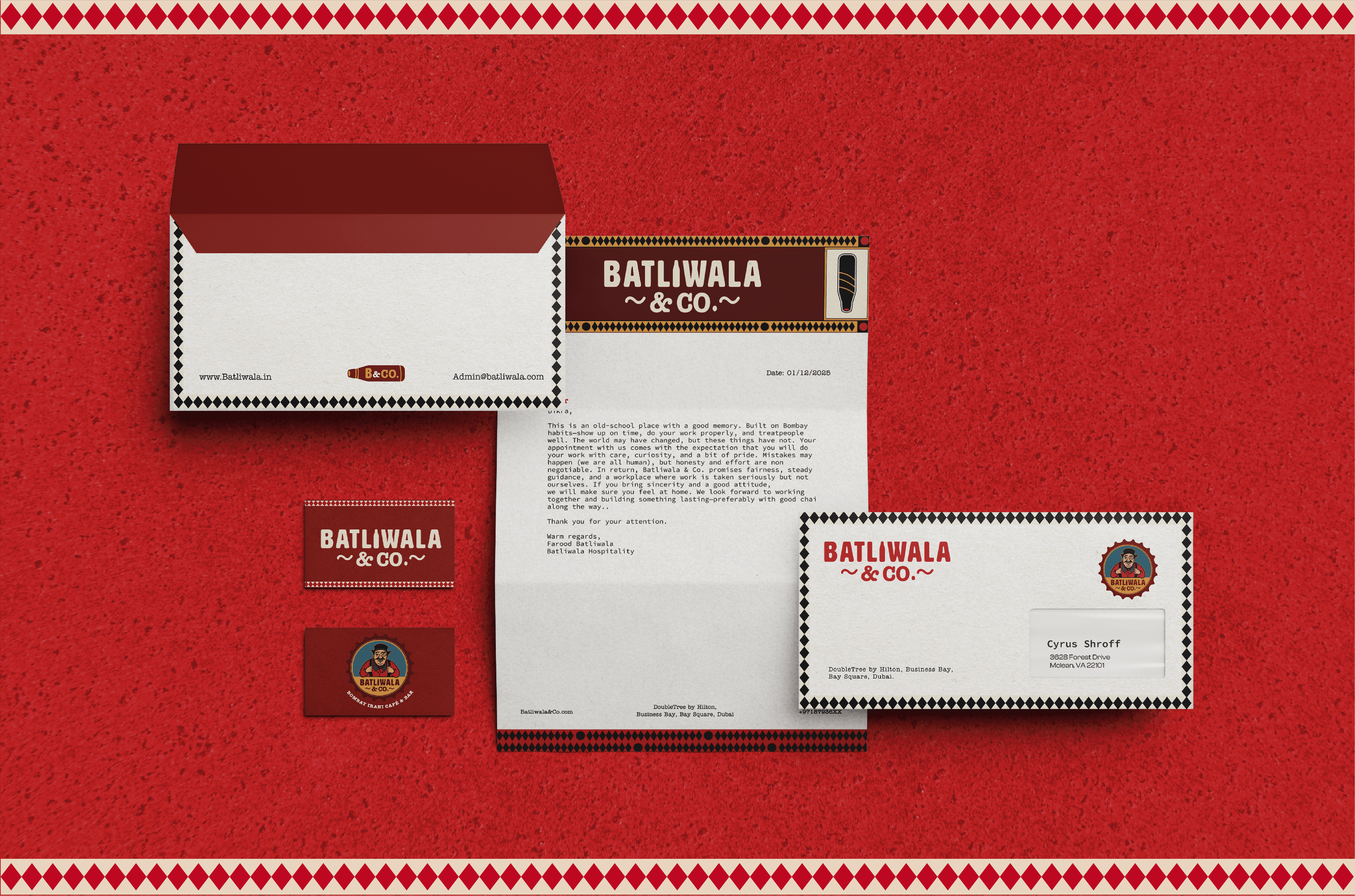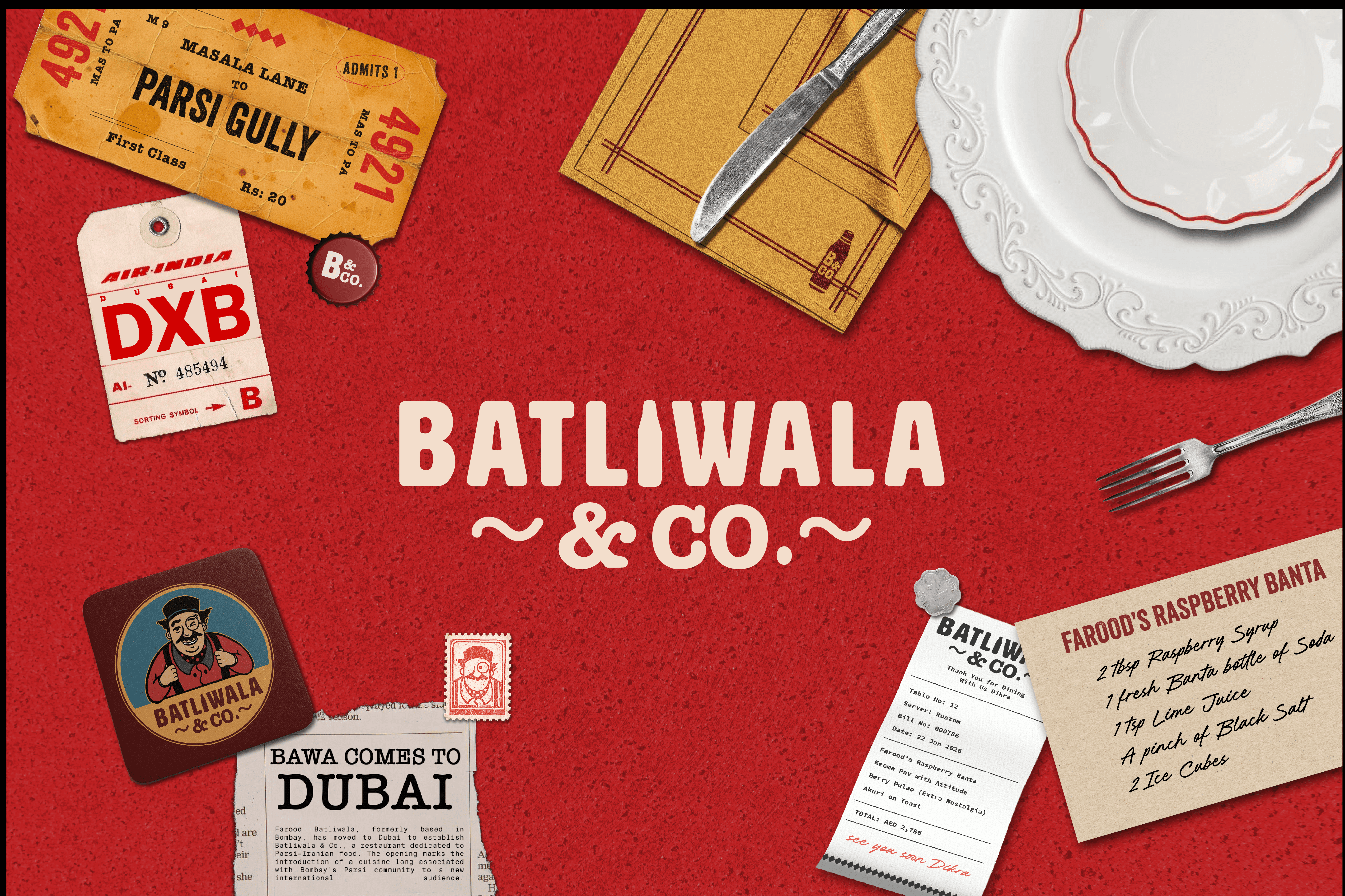 The solution was to embed that presence directly into the identity. This took form in Farood Batliwala — not as a mascot, but as a representation of the host figure intrinsic to Parsi–Irani café culture. His presence informs how the brand speaks, appears, and interacts. Through this approach, Batliwala & Co. extends the ethos of Bombay’s Parsi–Irani cafés into Dubai — preserving not only the cuisine, but the hospitality and cultural continuity that define it.